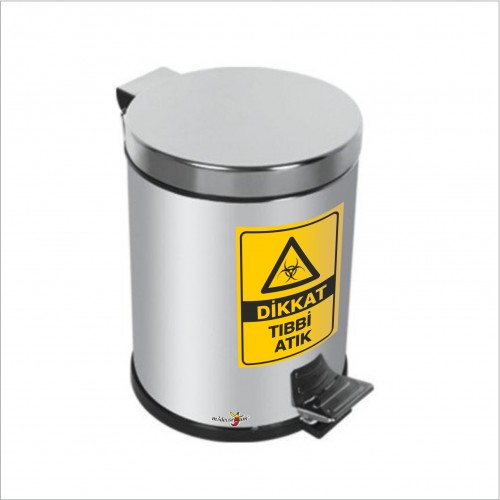 Pedallı Kovalı Saplı Kapaklı 5Lt. Paslanmaz Çelik Krom Tıbbi Atık Logolu Yazı Çöp Kutusu Kovası Kabı
